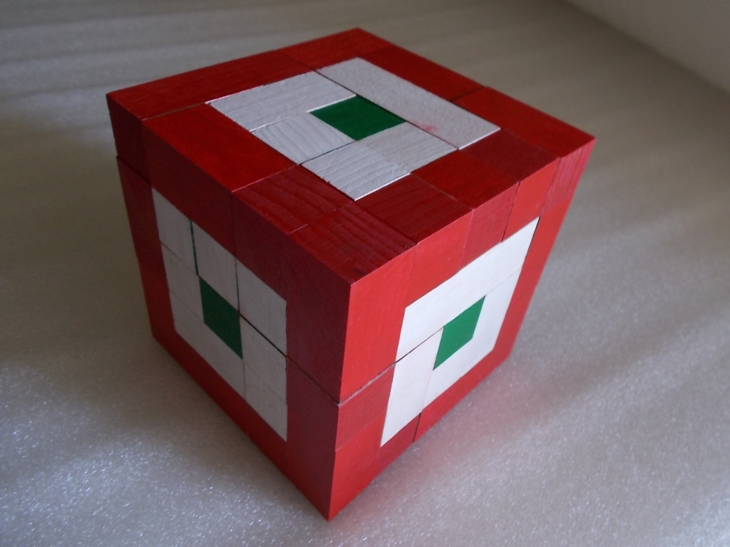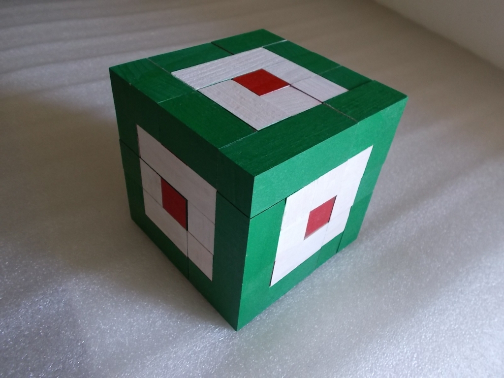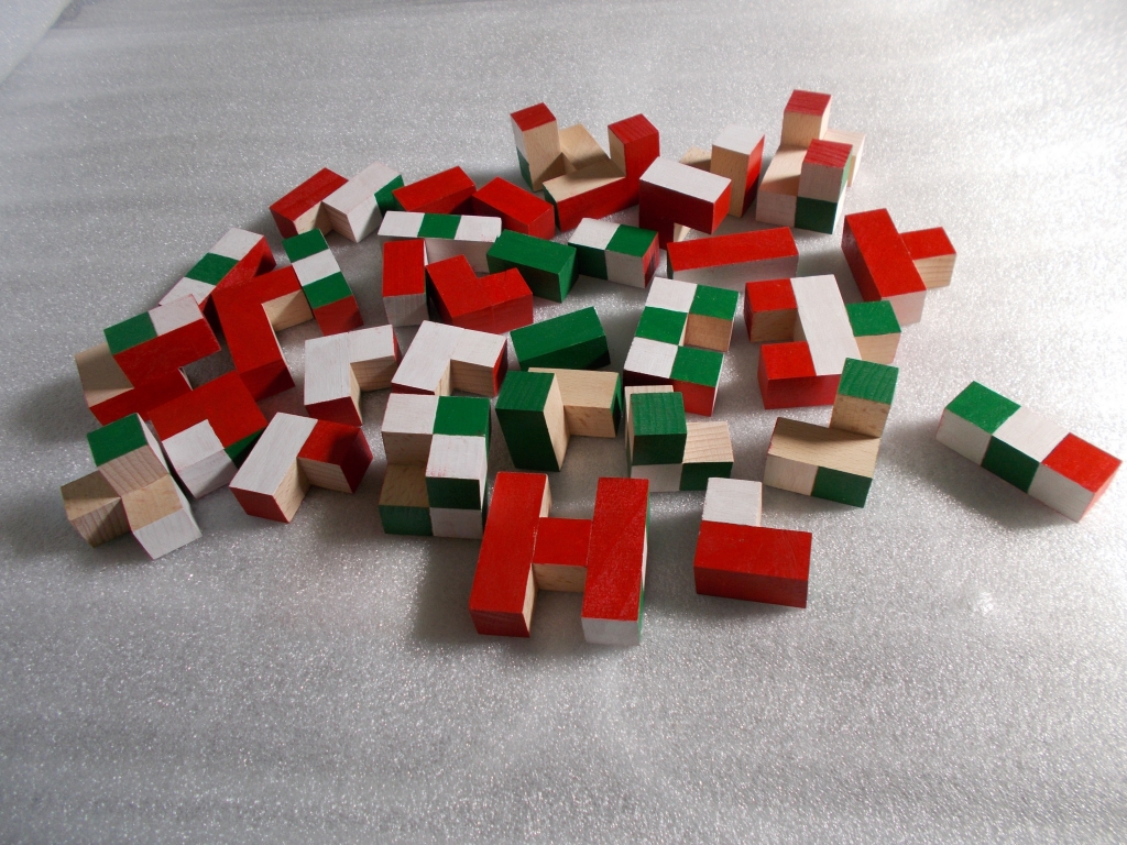 KOCKA: Az alapjáték egy olyan logikai feladvány, melynek lényege, hogy az összes játékelem felhasználásával háromszor lehet kirakni egy szabályos, tömör, 5x5x5-ös kockát úgy, hogy azok oldalai mindig más mintájúak (egyszínű, pepita, kokárda).
