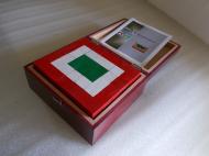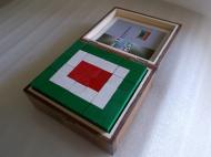 Anyaga ragasztott és festett faidomok. Lakkozott fadobozban, vagy papírdobozban küldjük játékszabállyal együtt. Kézműves termék.