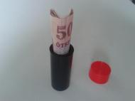 Megmutatunk a nézőknek egy kis csövet, amely le van zárva egy kupakkal. Levesszük a kupakot és a csőbe egy kicsire összehajtogatott bankjegyet teszünk. Lezárjuk a csövet a kupakkal, majd egy bűvös mozdulat után ismét levesszük a tetőt. A pénz eltűnt, csak a vízjel maradt utána, és kiöntünk a csőből egy kis vizet. Egyszerű kis kellék, mellyel apró dolgokat lehet eltűntetni, átváltoztatni.